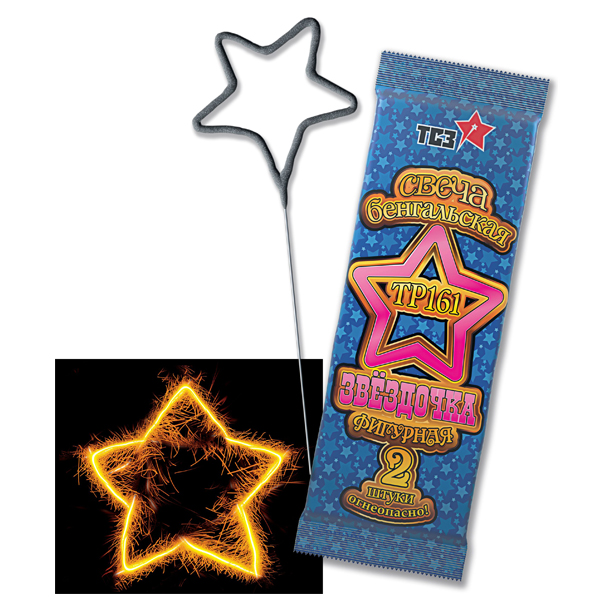 - Бенгальские огни - фигуры - проволочные каркасы этих бенгальских свечей изогнуты в виде разных фигур: звёзд, сердец, лебедей и т. п.